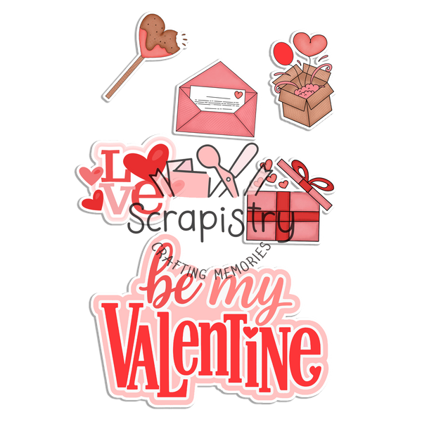 Coordinating embellishments featuring hearts, love notes, chocolates, and Cupid’s arrows