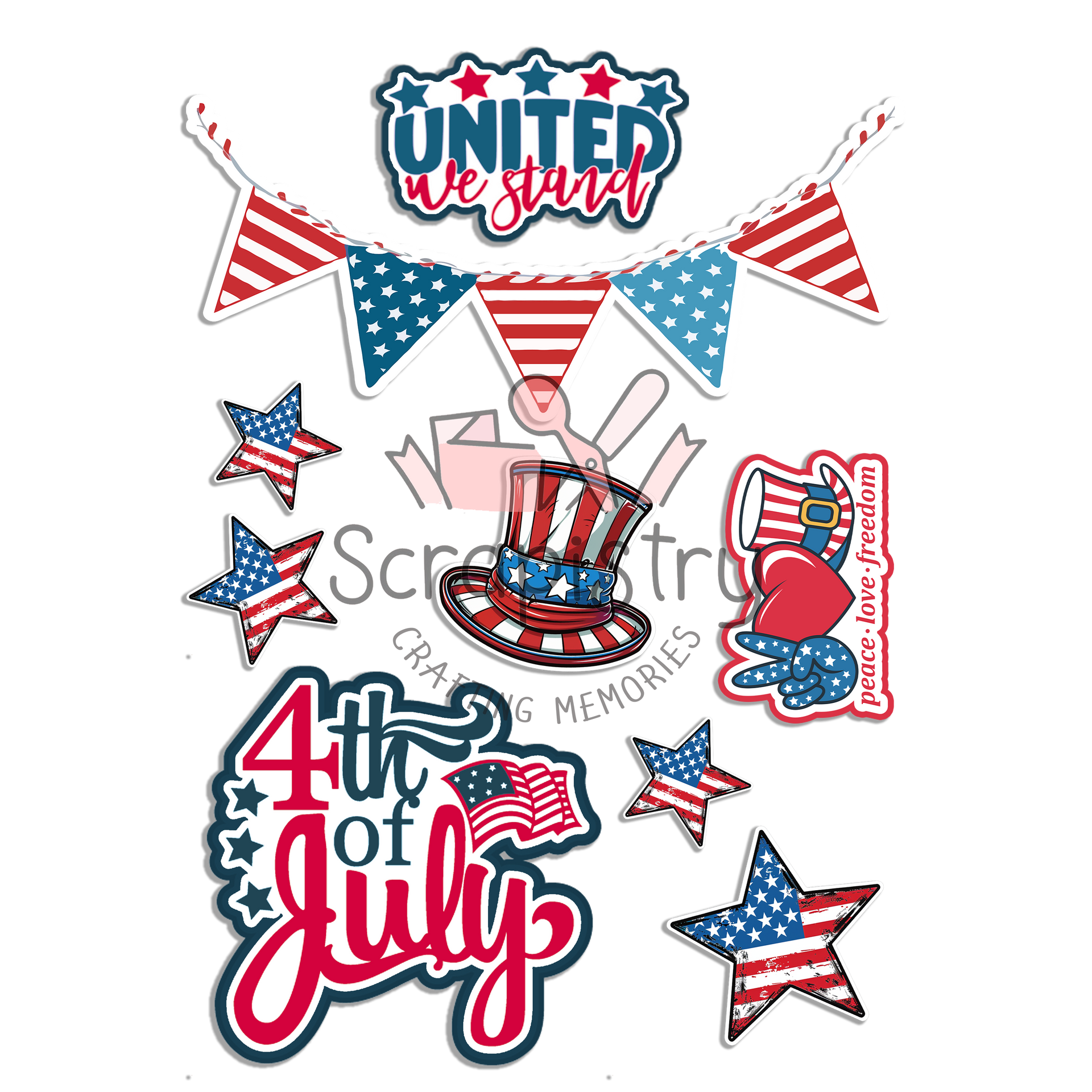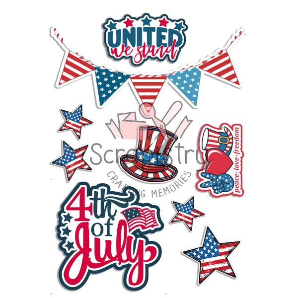 Coordinating embellishments featuring stars, stripes, flags, eagles, and USA tags